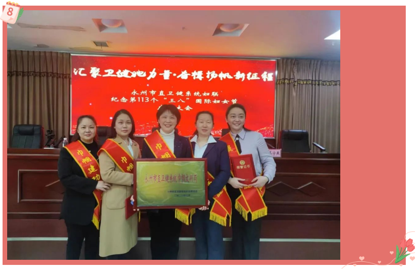 此外,医院女职工陈艳林、周凯林、唐晓玲、李凌云,以及医院八病区,分别获得永州市直卫健系统巾帼建功标兵、“最美家庭”及巾帼文明岗荣誉。
