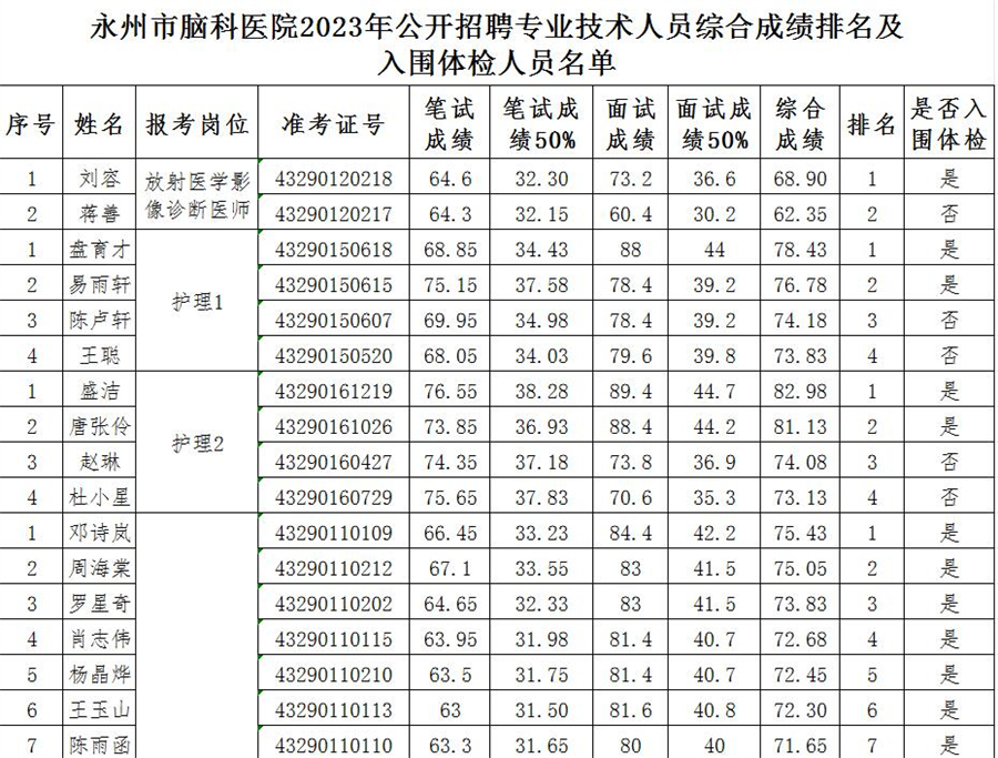 永州市脑科医院2023年公开招聘专业技术人员笔试、面试工作已全部结束。根据《永州市脑科医院2023年公开招聘专业技术人员公告》要求,现将入围体检人员名单(详见附件)及有关事项予以公告。