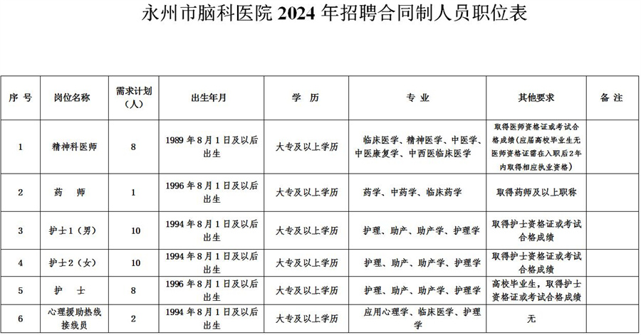 永州市脑科医院面向社会招聘专业技术人员共39名,详细招聘岗位、人数及岗位条件见附件1。