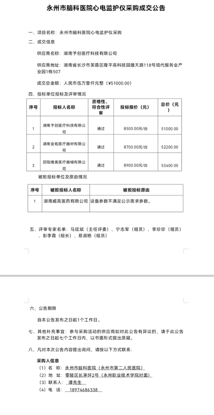 永州市脑科医院心电监护仪采购成交公告