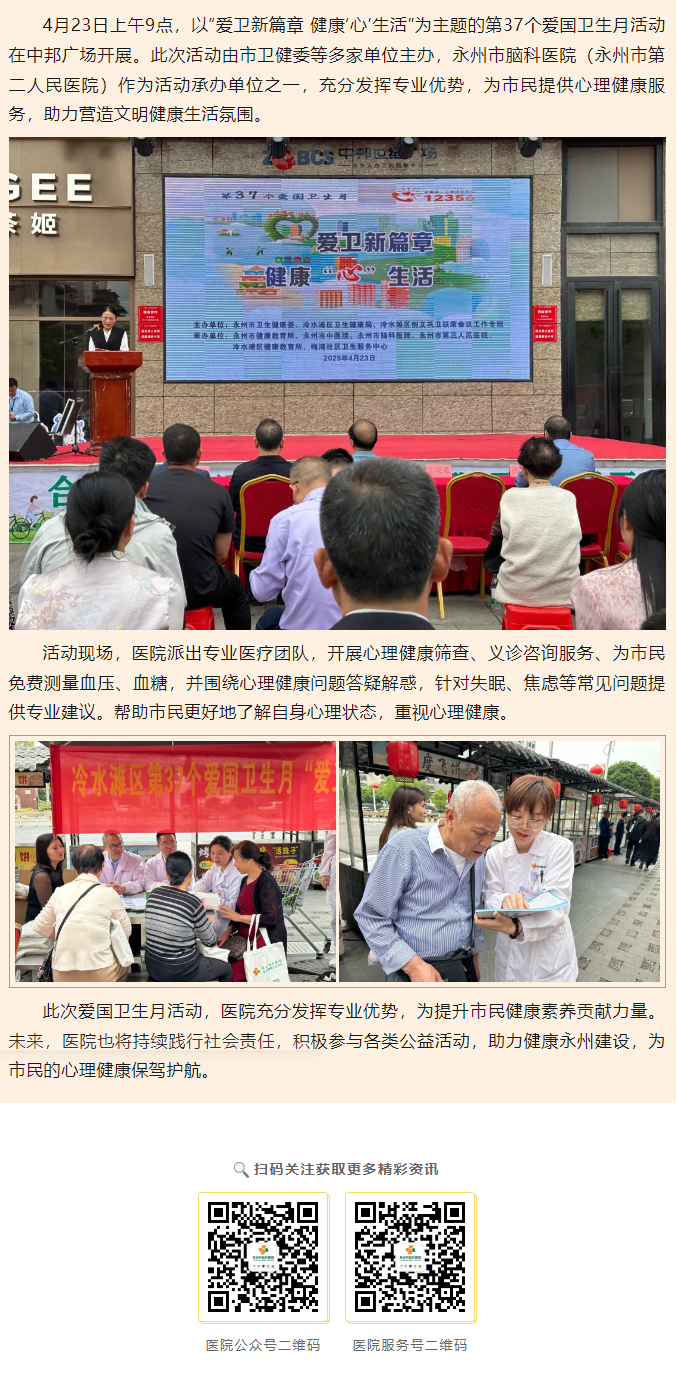 医疗服务提升年|永州市脑科医院(永州市第二人民医院)助力第37个爱国卫生月活动,守护市民心理健康