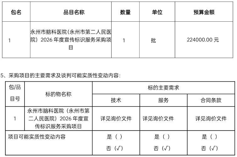 1、采购项目名称:永州市脑科医院(永州市第二人民医院)2026年度宣传标识服务采购项目