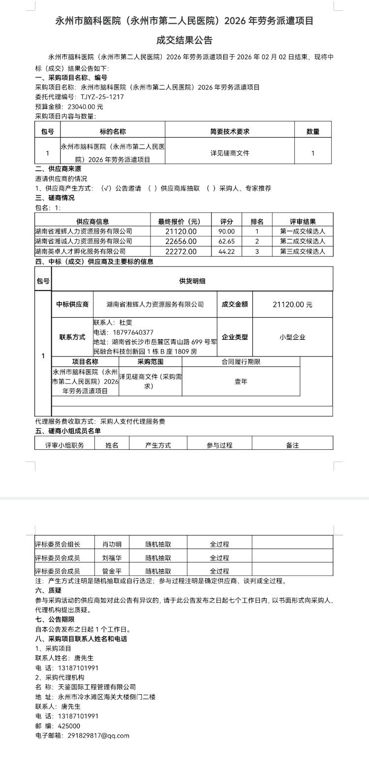 2026年劳务派遣项目 成交结果公告